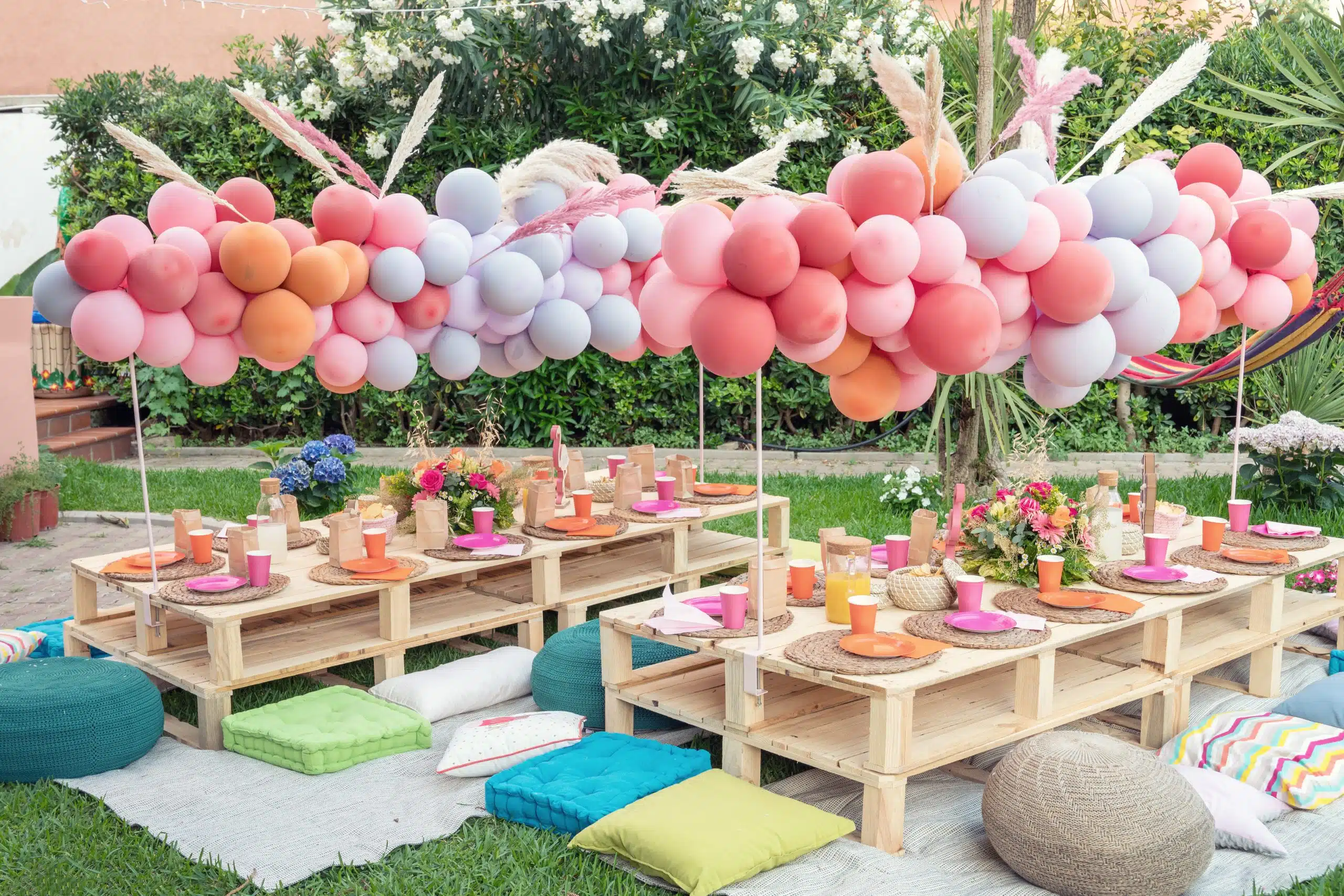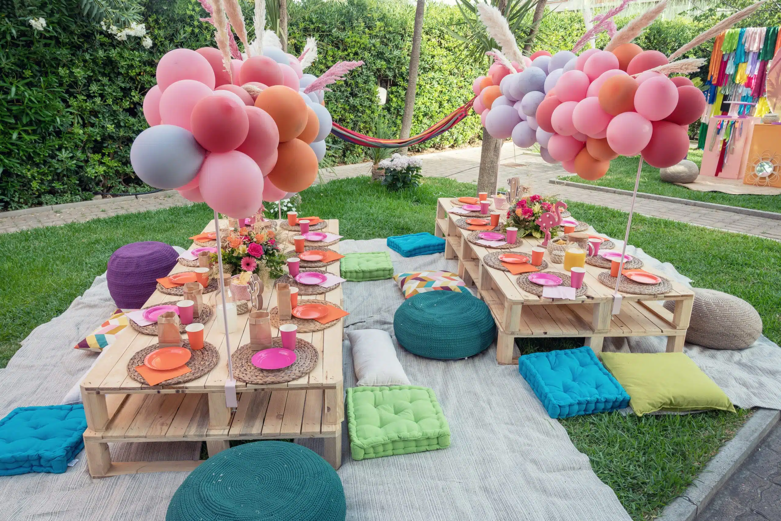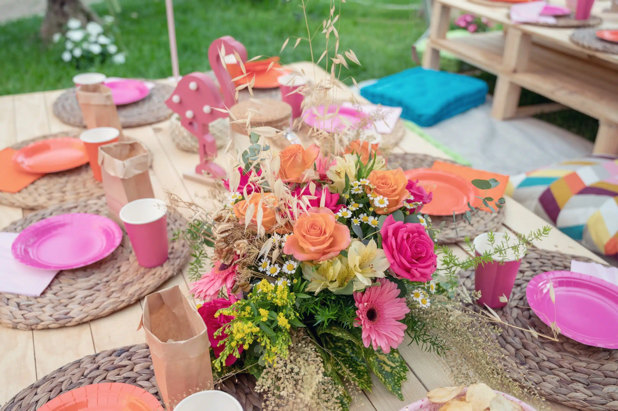 L'ALT text: Tavolo decorato con bouquet di fiori colorati e tavoli in stile bohemien per un matrimonio all'aperto organizzato da ChiaraB Events Wedding Planner.