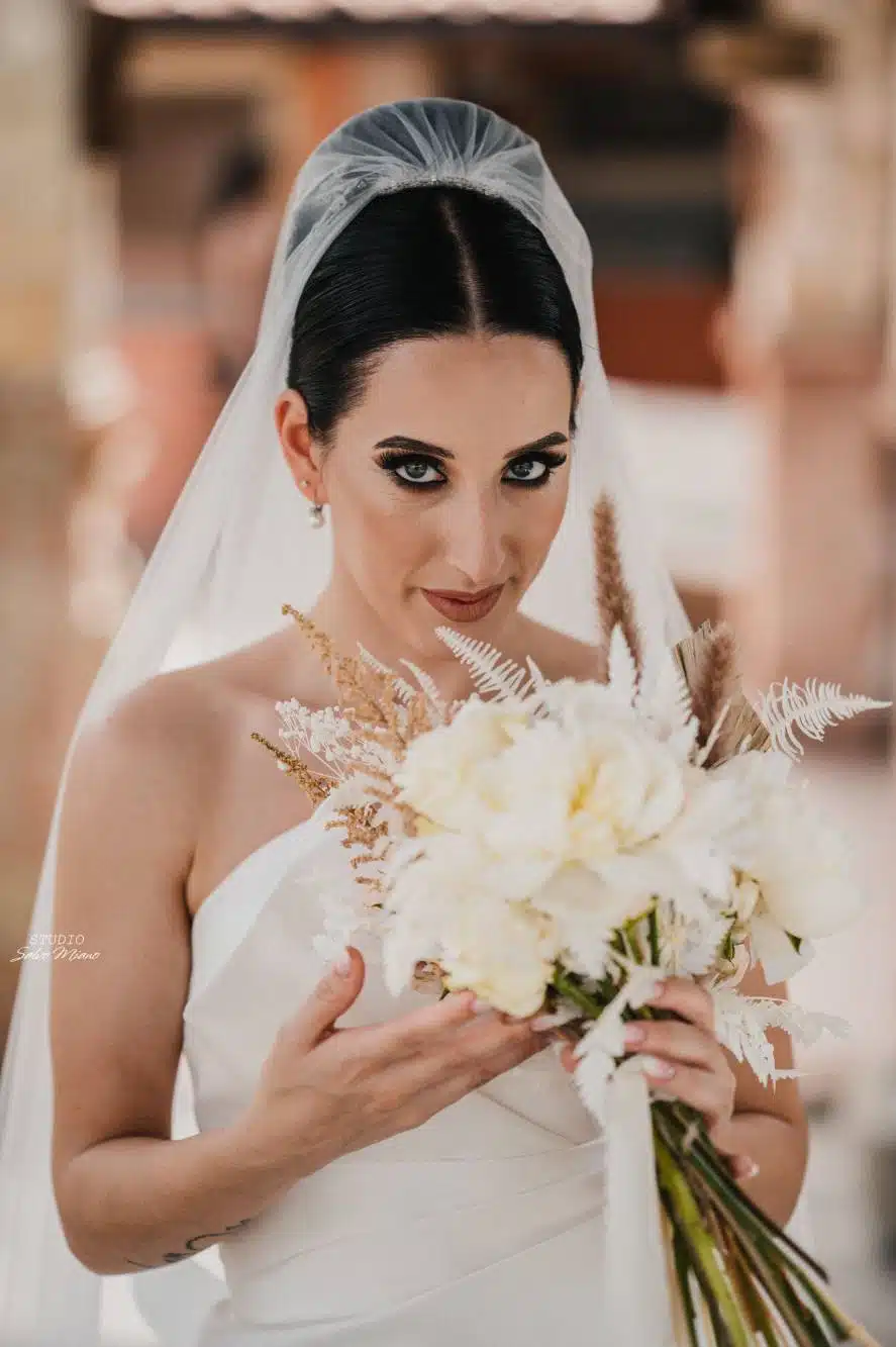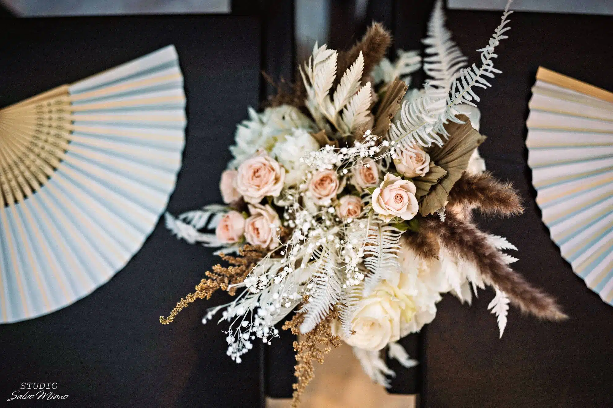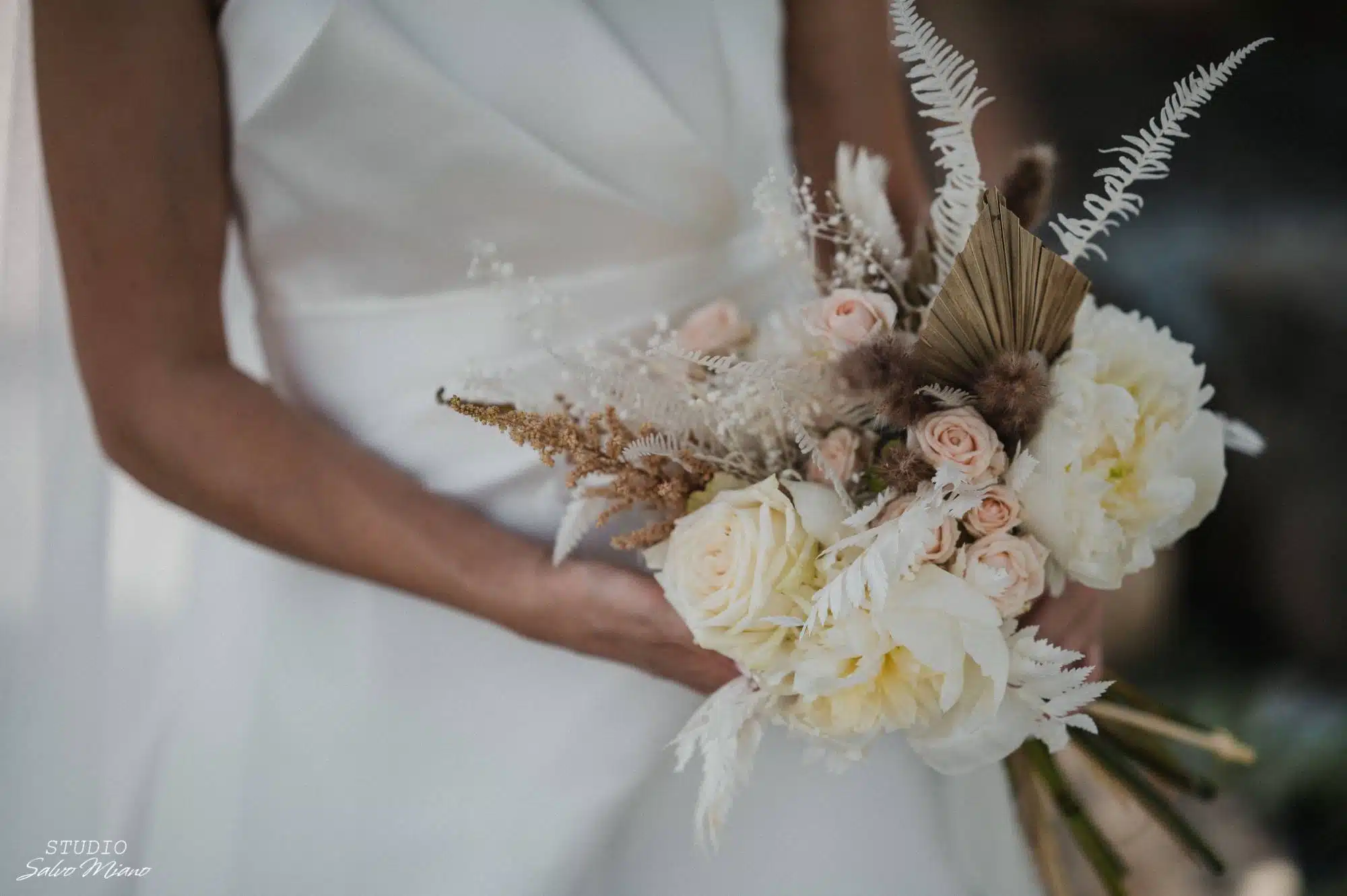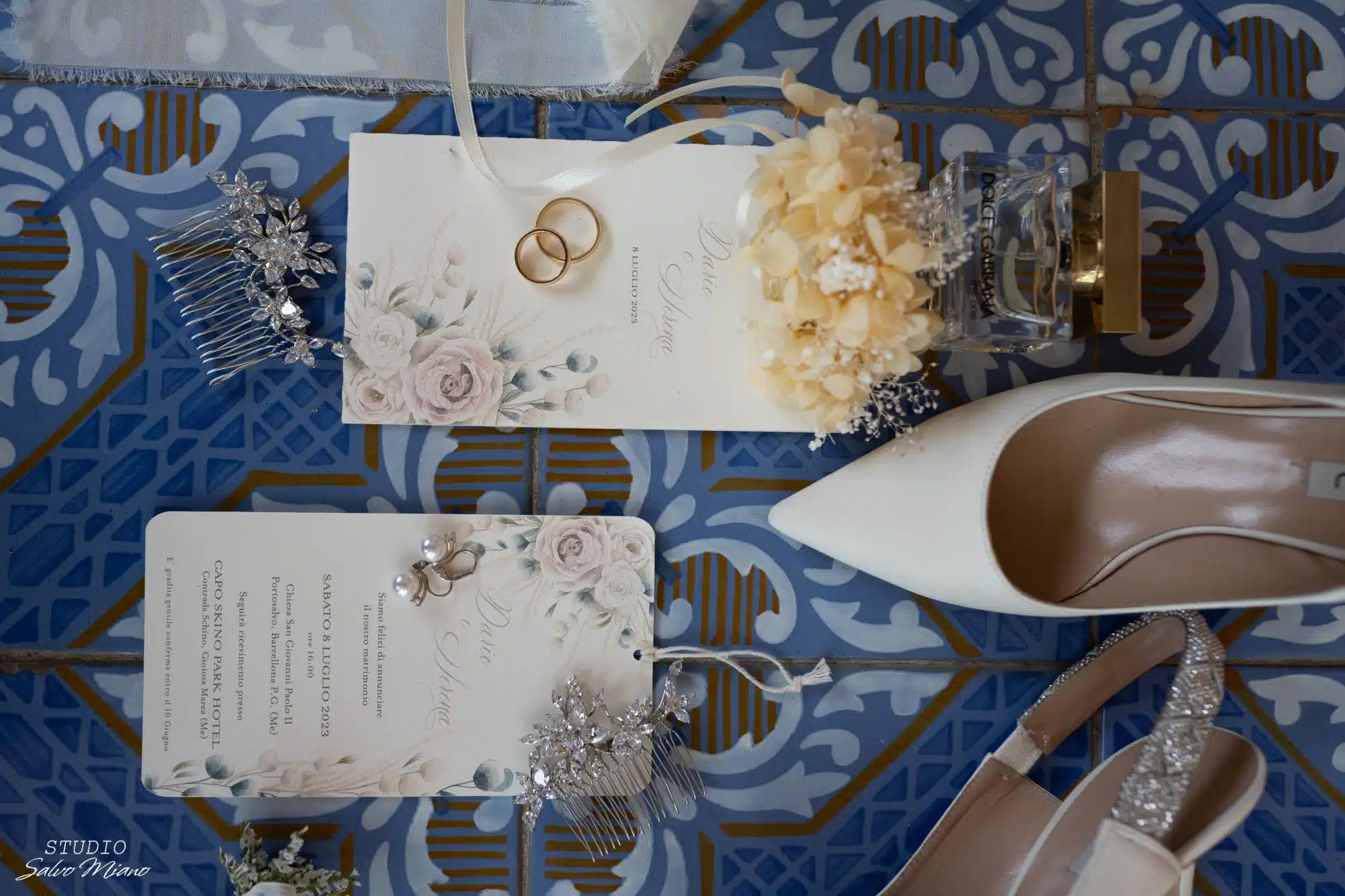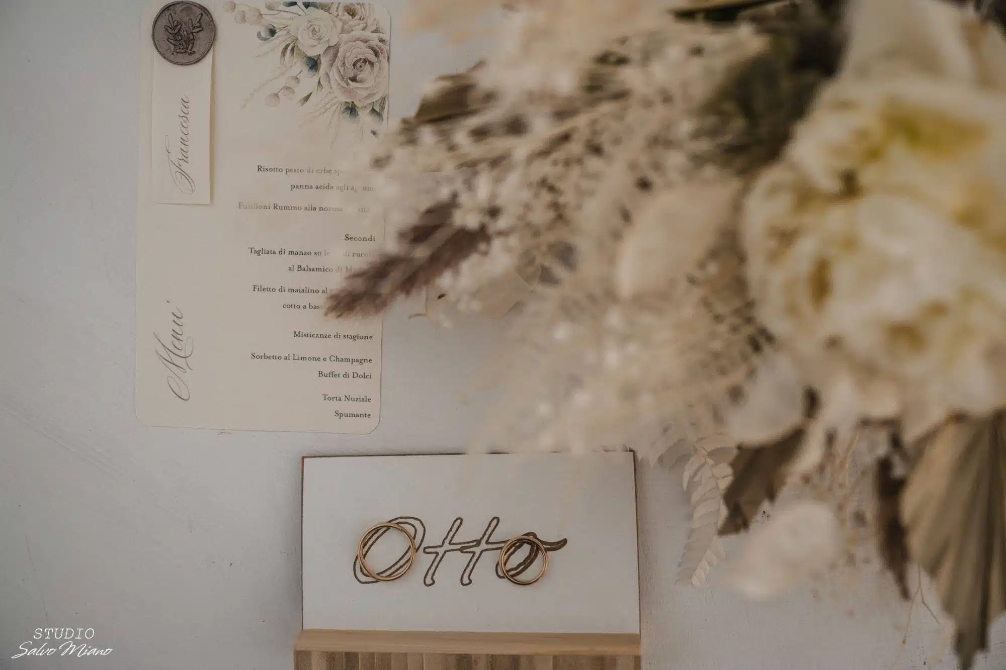 Invito di nozze con bouquet di fiori e anelli, dettagli eleganti matrimonio, wedding planner ChiaraB Events, organizzazione eventi matrimonio, accessori sposa e bomboniere.